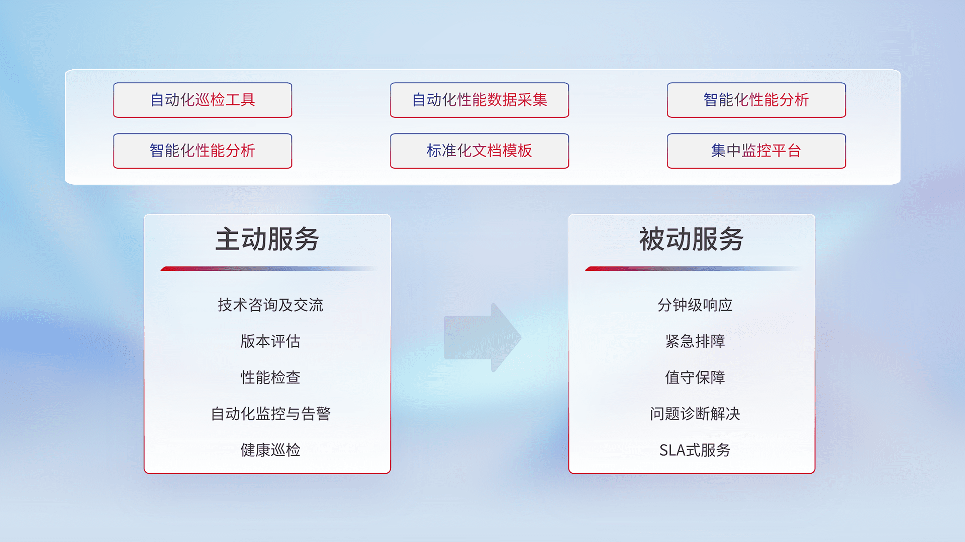 智能化工具和标准化文档,,,,保障服务质量,,,,提供主动服务(包含技术咨询、、版本评估、、、、性能检查、、、自动化监控与告警、、、健康巡检)和被动服务包含(分钟级响应、、、紧急排障、、、、值守保障、、、、问题诊断解决、、、SLA服务)。。。。